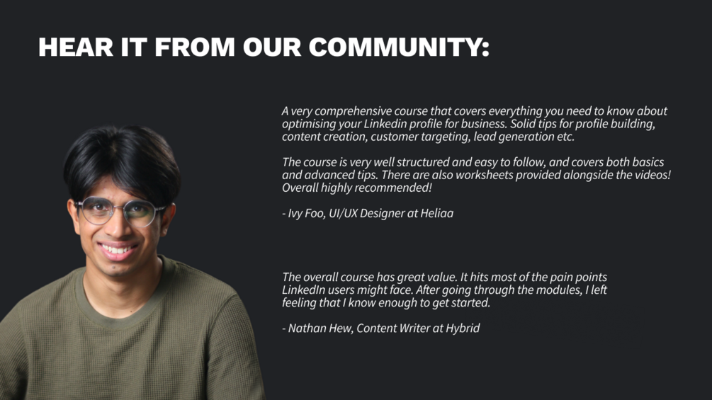 "The overall course has great value. It hits most of the pain points LinkedIn users might face. After going through the modules, I left feeling that I know enough to get started." - Nathan Hew, Content Writer at Hybrid